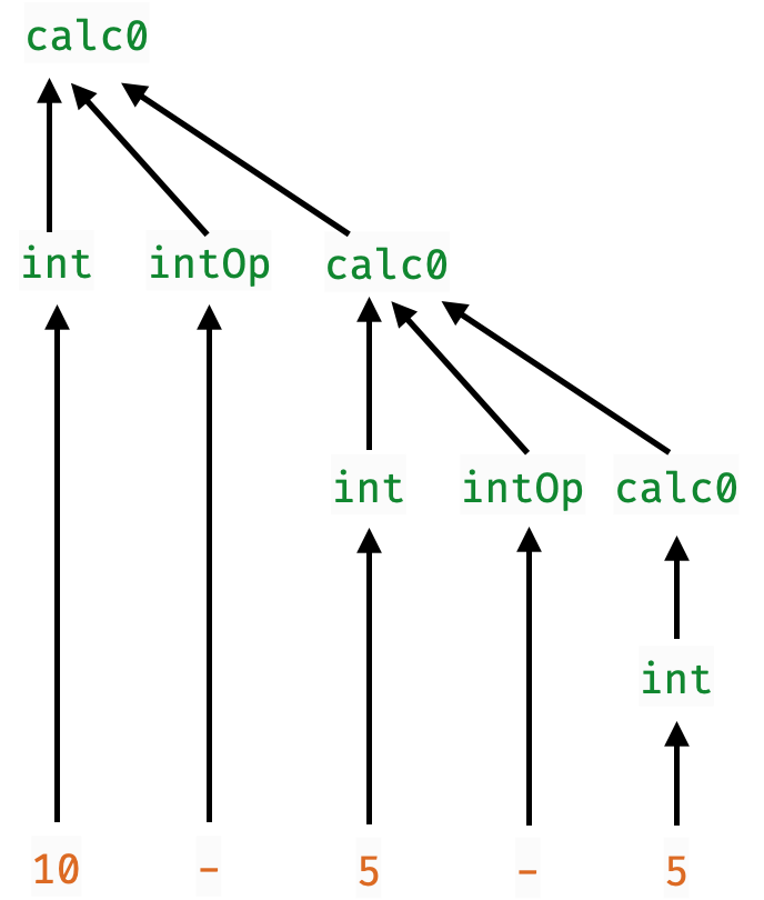>>> runParser calc1 "((10-5)-5)"